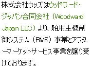 2002年、日本ウッドワードガバナー株式会社(現 ウッドワード・ジャパン株式会社)は、舶用制御システム(BMS)事業と、従来からのガバナ(及びシステム)のアフターマーケットサービス事業を営業譲渡し、ウッズはそれらを譲り受けました。